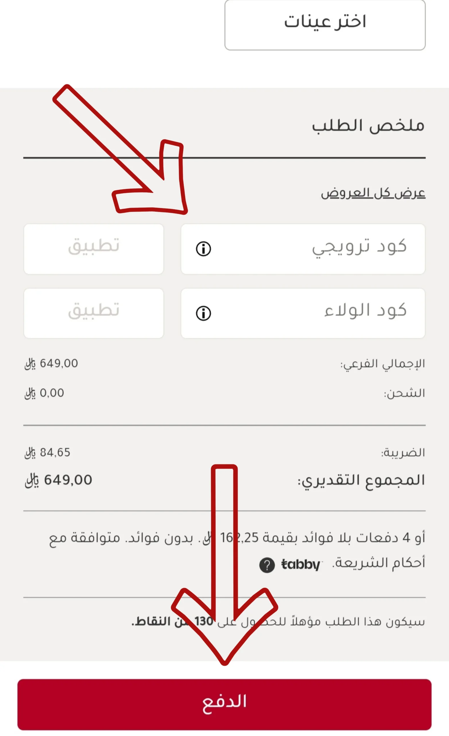5. ستنتقلي إلى صفحة مشترياتك، اضغطي على خانة كود ترويجي، قومي بلصق كود الخصم المتاح لدينا ثم اضغطي تطبيق.