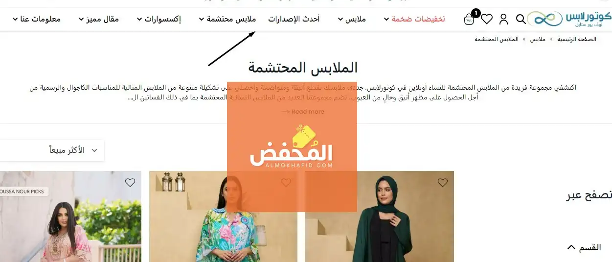 قسم الملابس المتحشمة: كل العبايات، القفطان، الحجاب بمختلف أشكاله والطرازات التي يظهر بها وكذلك الأمر مع باقي ملابس القسم متوفرة في مكان واحد بالموقع وهو المخصص للمحتشمين.