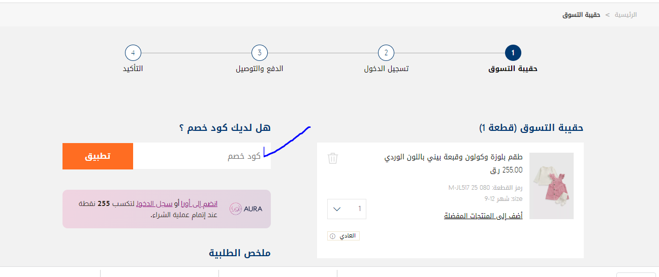اضغط على إظهار الحقيبة تظهر كافة تفاصيل المنتج والعمر المناسب له وخانة كوبون الخصم، ثم يتم لصق الكود والضغط على تطبيق.